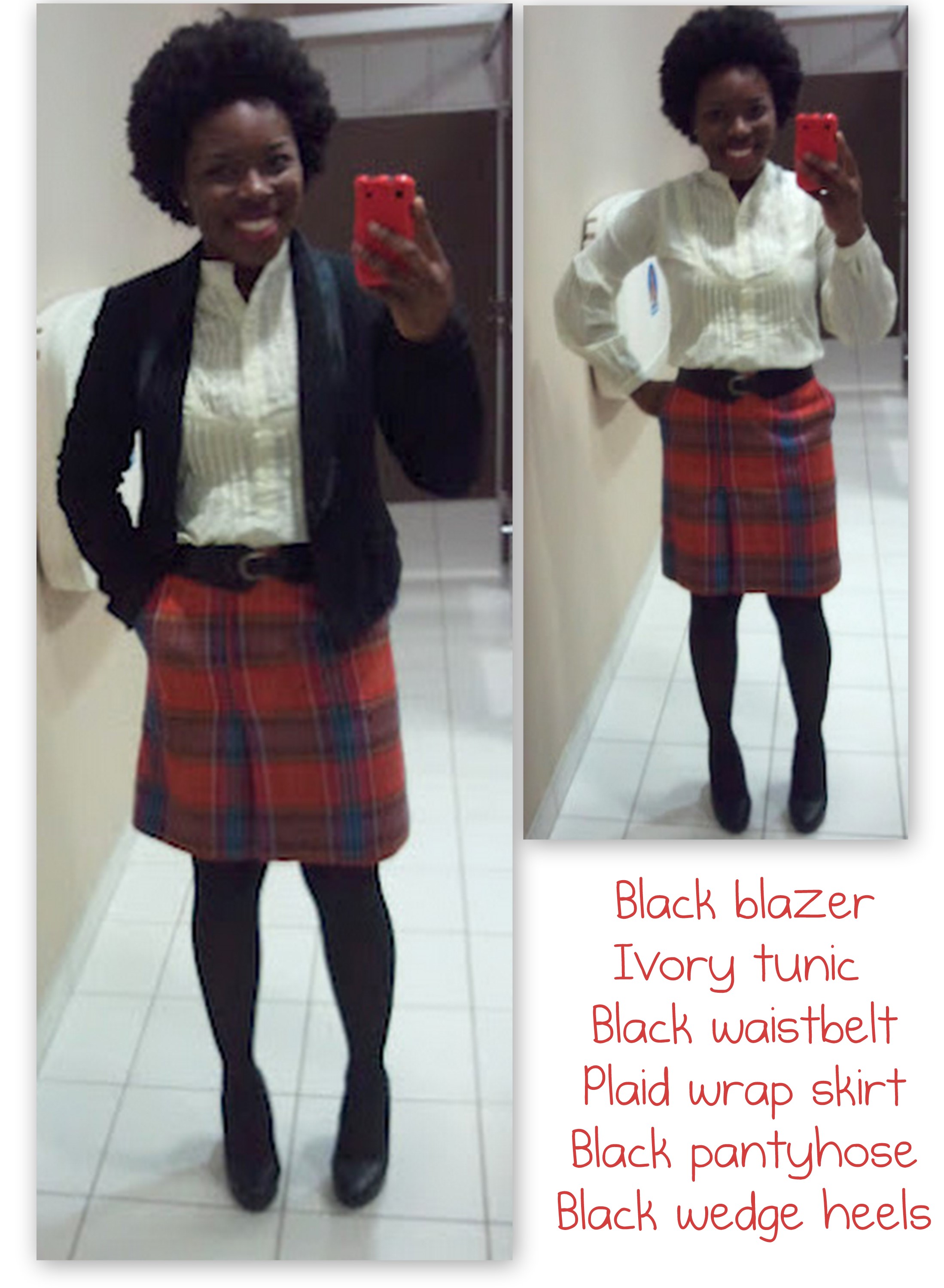 I got the blazer from Forever 21 a couple years ago. I wear it for interviews or “business” occasions. One day I’ll save up and get fitted for a legit suit. Tunic was borrowed from my sis, Dee. Wrap skirt is thrifted. Check out how it’s wrapped.