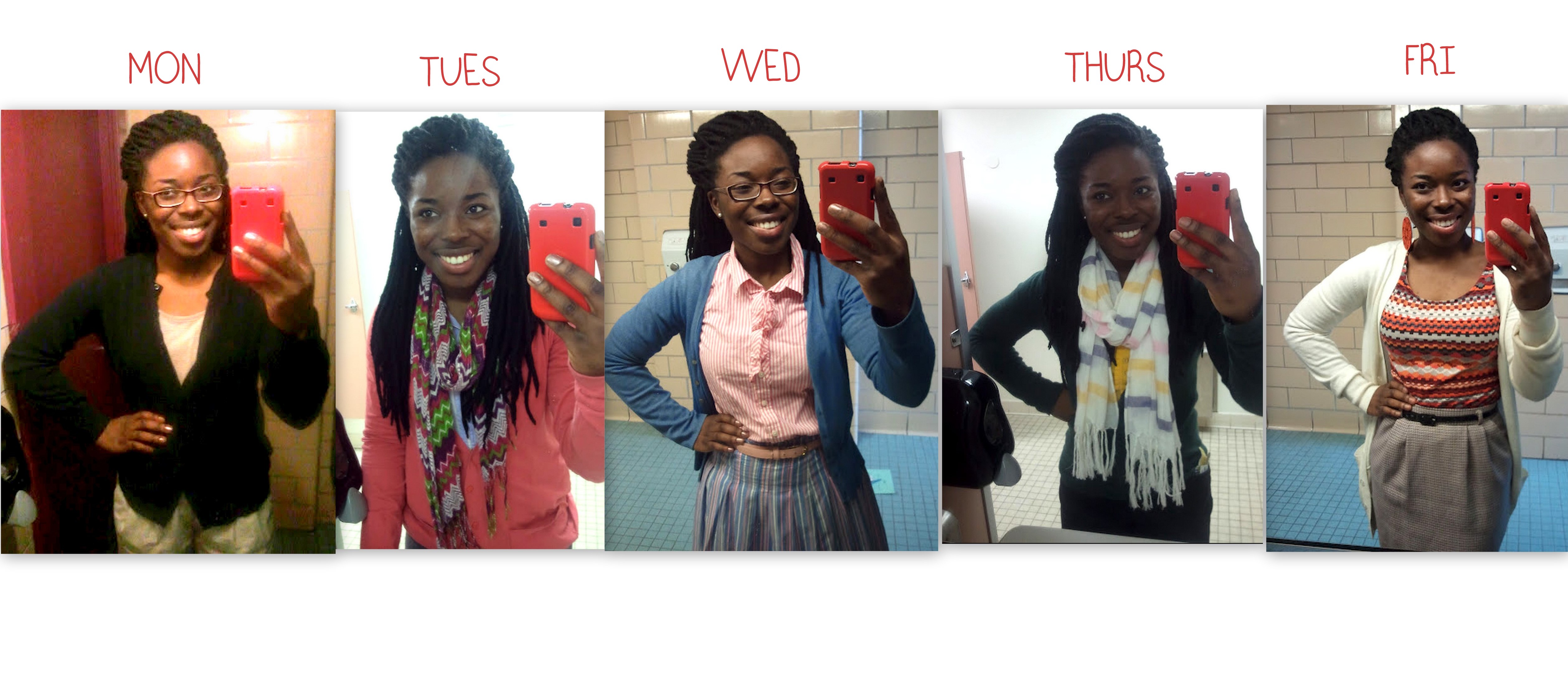 My favorite outfit was Friday’s outfit. It’s actually a short dress with a belted skirt on top. I stole this idea from my sis, Ineye. The bright earrings were from a beauty store!