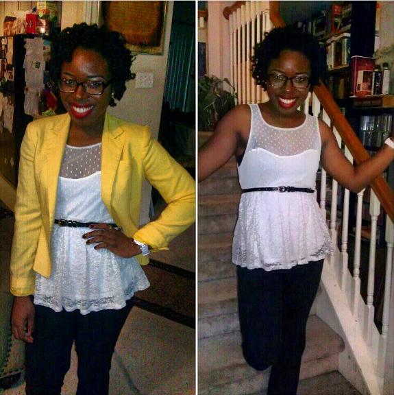 Sunday Best #18 September 30, 2012Sunday BestTimiKomo I retwisted and curled my hair last night with pipe cleaners. This is my first time trying this style and I liked the turn out. My co-worker, Lenithia, gave me this bold yellow blazer and I paired it with a Forever21 lace blouse. Share this: Click to share on X (Opens in new window) X Click to share on Facebook (Opens in new window) Facebook Click to share on Pinterest (Opens in new window) Pinterest More Click to share on Tumblr (Opens in new window) Tumblr Like Loading... Related