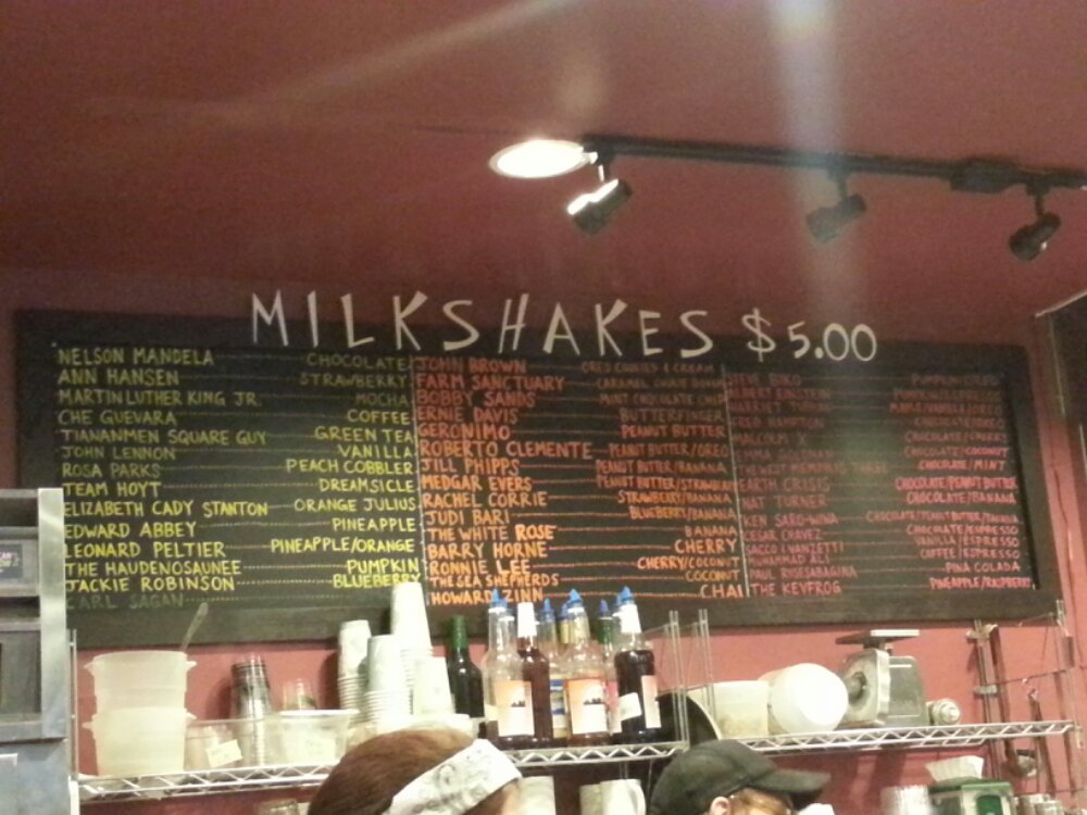 I stepped up to the counter and burst out laughing at the names of the milkshakes. They were combinations with titles like “Nelson Mandela”, “Elizabeth Cady Stanton”, “Cesar Chavez”