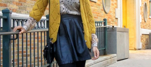 Ashley’s combination of bright colors, patterns and textures are spot on. She’s wearing a mustard 3/4 sleeve knit cardigan, a rust knit circle scarf, beige chiffon bird-patterned blouse, leather skirt, black tights, gray ankle socks, and cognac oxford shoes.