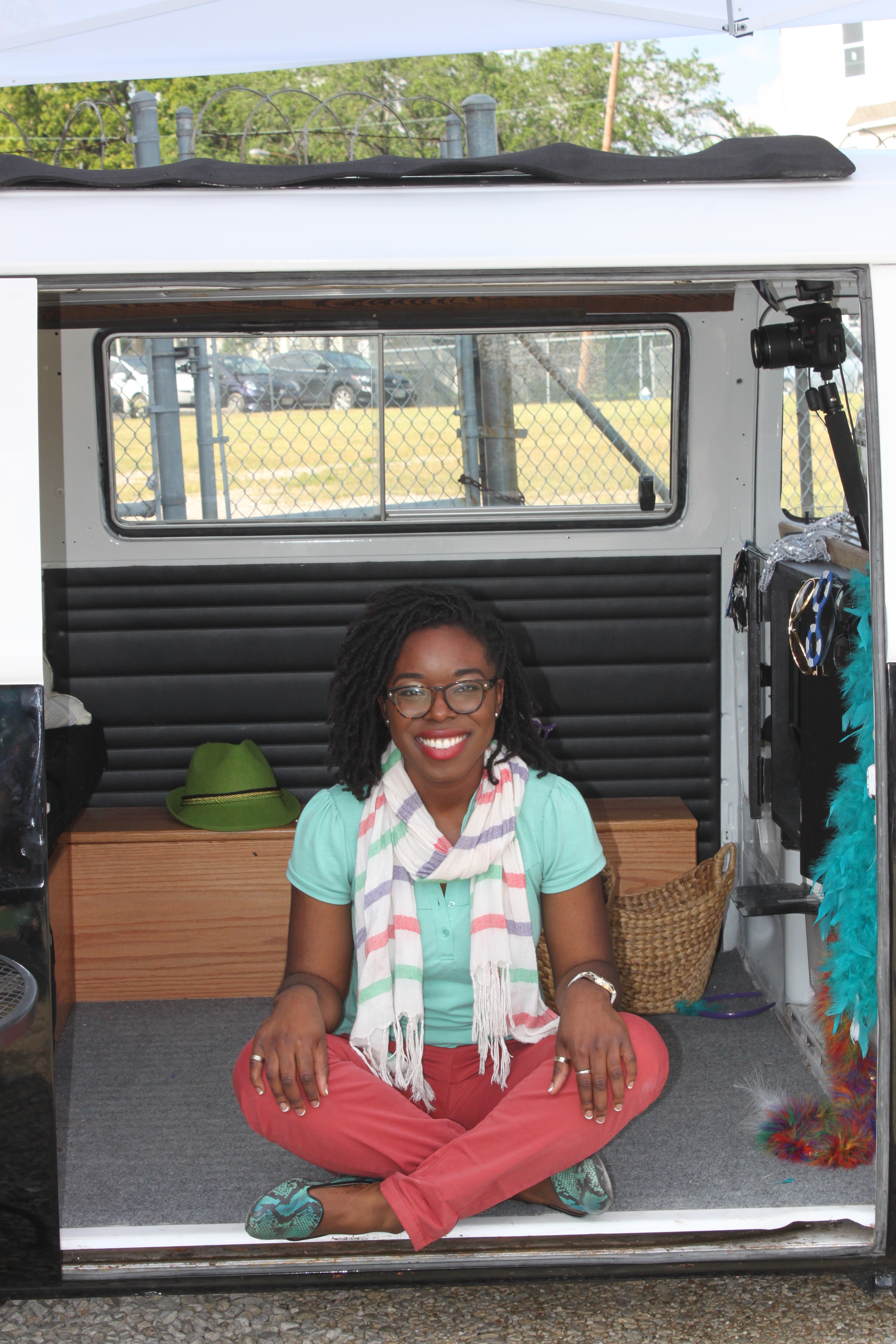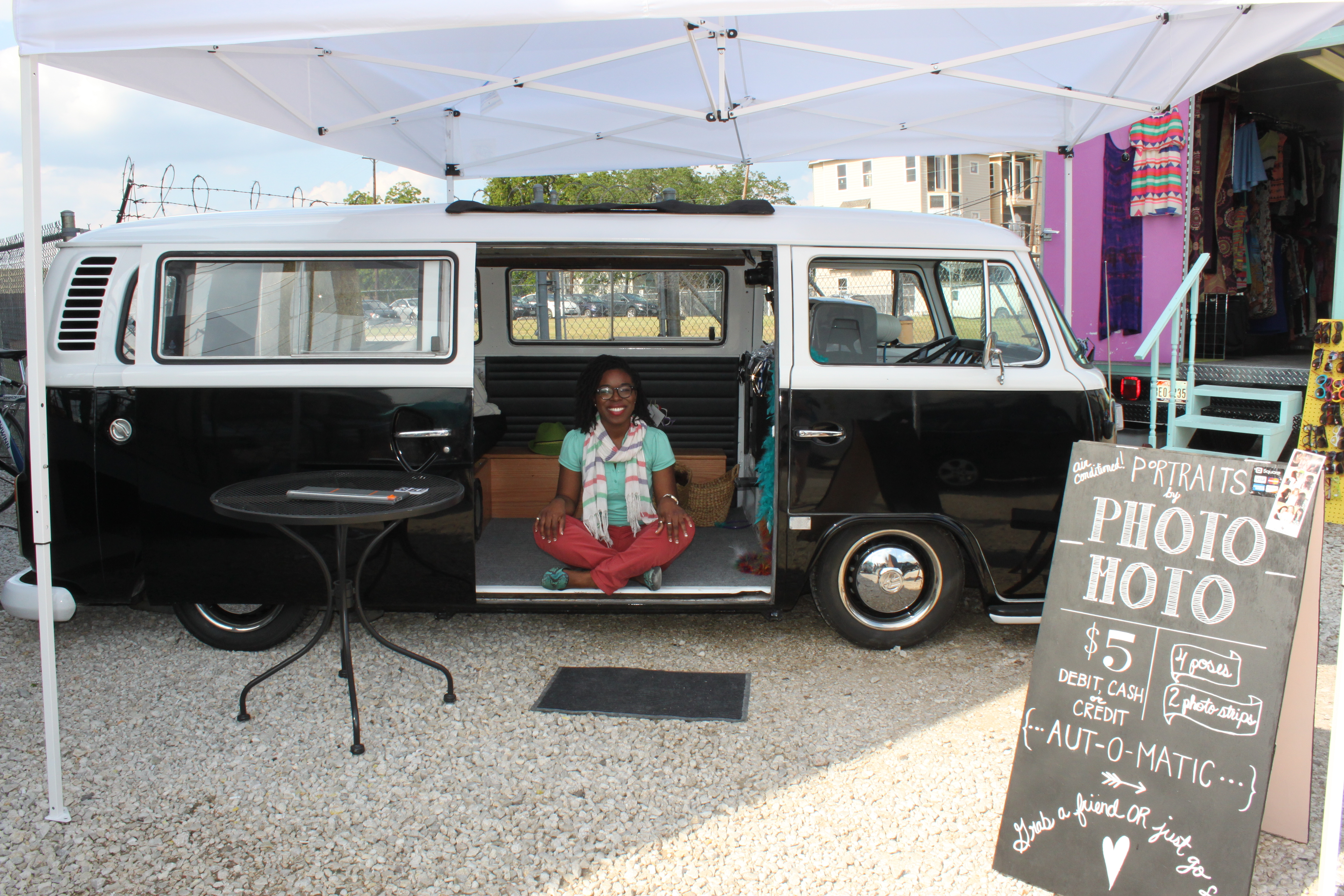 We stopped by PhotoMoto, a vintage truck with a photo booth set up inside with props included. We paid $5 and got a set of two photo strips.