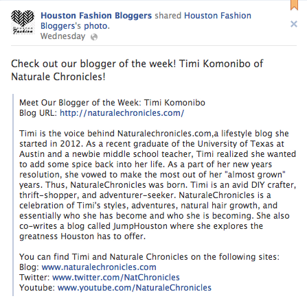 I’m humbled to be given this nomination by the talented bloggers at Houston Fashion Bloggers. I’m also excited and encouraged by all the encouraging feedback I’ve been getting from family, friends, and even strangers. I started Naturale Chronicles for people who, like me, who were going through a transitioning time in their lives. Whether it be graduating from college, moving to a new city, going natural, changing up your look, I relate to you in some way. I want to share my experiences with you so we can learn together.