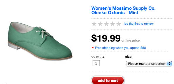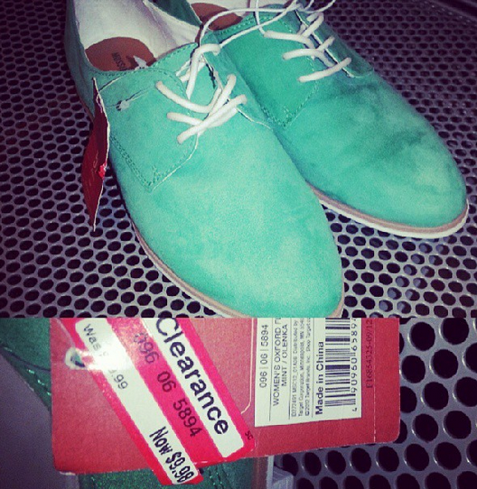 I have had my eyes on this chic pair of mint green Oxford shoes. My neighborhood Target only had them in size 5, for only $9.98!!! This was the first time in a long time I was dissatisfied with my size 8 feet.